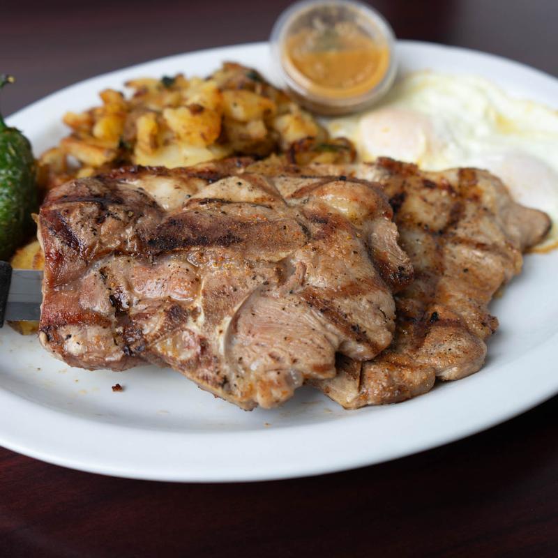 With hash browns or Rodeo potatoes, 2 XLG eggs and choice of buttered toast, English muffin, biscuits & gravy or Tortillas, Egg whites only add +$1.50 | Add an Additional Egg for $1.95